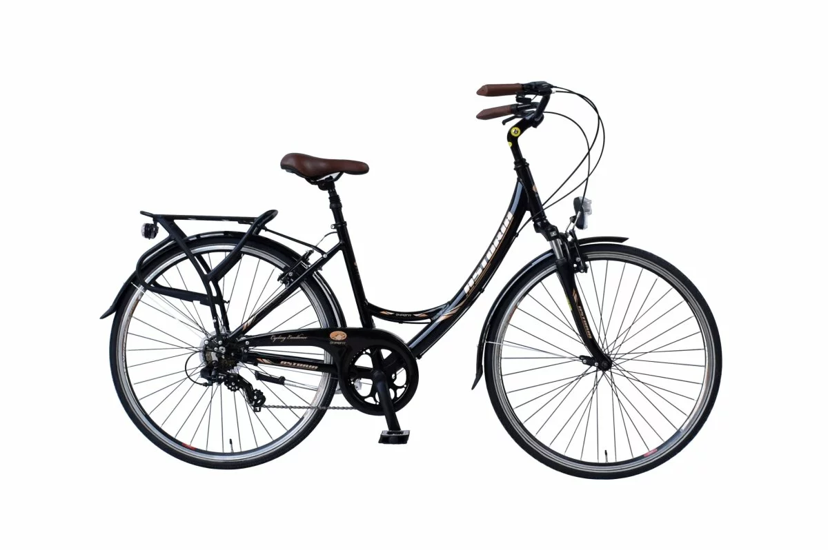 7 hastighed. Shimano Tourney STI, Suspension Fork, Suspension Seat Post, Battery Lighting, Alu V-bremser og bremsehåndtag, dobbeltvæggede fælge med dobbeltvæggede fælge og aluminiumscentre, aluminiumspakker, justerbare stamme, reflekterende dæk.