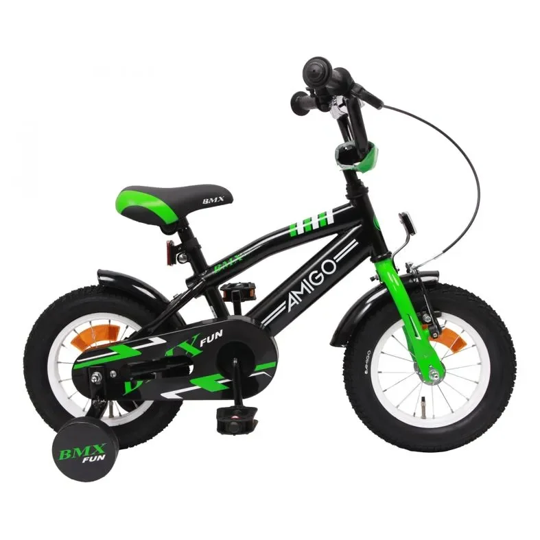 Amigo BMX Fun Boys ‘Bike Denne sikre og hårde cykel er det perfekte springbræt til at lære cykling. Gennem sidehjulene kan børn praktisere uendeligt trappen og styrebevægelser. Og hvis det går uden problemer, kan du ubesværet fjerne sidehjulene fra cyklen for at starte det rigtige arbejde. lukket kædevagt Ved sikkert at afskærme kæden får du ikke beskidt tøj. Det sikrer også, at kæden ikke bliver beskidt og fortsætter med at fungere godt. Men det er alt sammen et sideproblem, når du ser, hvor cool kædebeskyttelsen er. Med hårde striber og logoet til Amigo BMX Fun in the Design stjæler du utvivlsomt showet. Robuste dæk med et navn som BMX Fun, du forventer naturligvis så meget glæde og stunts som muligt. De stærke dæk sikrer, at du ikke behøver at tvivle på det. På grund af den robuste profil, for eksempel, kan du nemt slippe af med vejkanten. De er lavet til hvert sted og understøttes af lige så robuste aluminiumfælge. Klar til hvert eventyr! sidehjul for stabilitet Intet er så vanskeligt som at finde balance på cyklen. Derfor er disse sidehjul perfekte til dem, der ønsker at lære at cykle. Du kan øve dig på trapper og styre gennem sidehjulene, så du bliver vant til det. Hjul af høj kvalitet er lavet af stål og plast og tilbyder derfor en masse støtte. Cyklen til dig Leder du efter en robust og cool begynders cykel? Så er Amigo BMX -sjovet din ideelle kandidat! Denne sikre cykel er det perfekte skridt til at lære at cykle. Gennem sidehjulene kan børn praktisere uendeligt trappen og styrebevægelser. Og hvis det går uden problemer, kan du ubesværet fjerne sidehjulene fra cyklen for at starte det rigtige arbejde. amigo hos Amigo har vi en cykelkammerat til alle! Ægte hollandske design, og det til en meget venlig pris. Med disse muntre cykler foretager børn deres første små ture gennem gaderne. De robuste træningshjul hjælper børnene med at holde deres balance, mens de vænner sig til trappen og styringsbevægelser. Cyklerne har en stabil ramme og fås i utallige farver og forskellige dækstørrelser. Vil Amigo være din nye bedste ven? Generelle specifikationer: Farve: Sort/grøn køn: Drenge Materiale: Stålvægt: ca. 9,5 kg dæk: sort luftdæk Amigo M1500 12 x 2.125 tommer (50-203) fælge: Enkeltvæggede aluminiumfælge Gear: 1 Specifikationer: Hjul Størrelse: 12 tommer rammestørrelse: 21 cm sadelhøjde: 47,2 cm (i den laveste position, målt fra jorden) Sadelhøjde Justerbar: Ja Specifikationer Inhibit: Type bagbremse: Fair Brak Type Front Brake: V-Brake Specifikationer Tilbehør : Kædebeskyttelse: Sidehjulkæde Ja, aftagelig belysning: Forreste og bageste reflektorer med bracket cykelklokke: Ja
