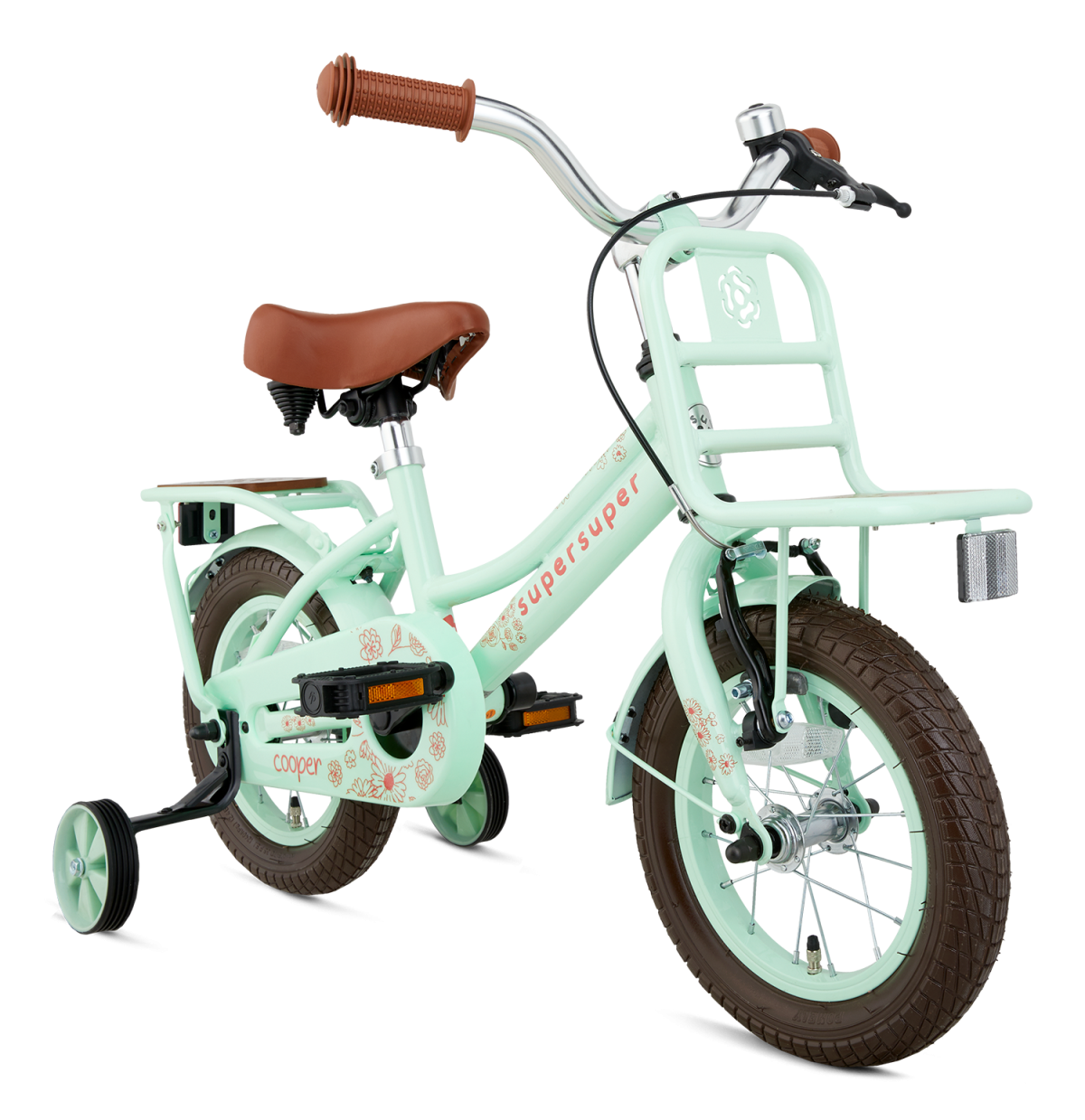 Skøn børnecykel til piger i klassisk retro design med trendy detaljer. Cyklen har meget flot pistacie sartgrøn farve, der kombineres rigtig godt med de brune cykeldæk, samt bred og komfortabel saddel og med håndtag i brun farve, der samtidig matcher bambus plader på bagagebæreren og frontladet, som giver cyklen en unik og miljørigtig karakter. Cyklen leveres med aftagelige støttehjul, så den er ideel som den første rigtige børnecykel (cykel med pedaler).