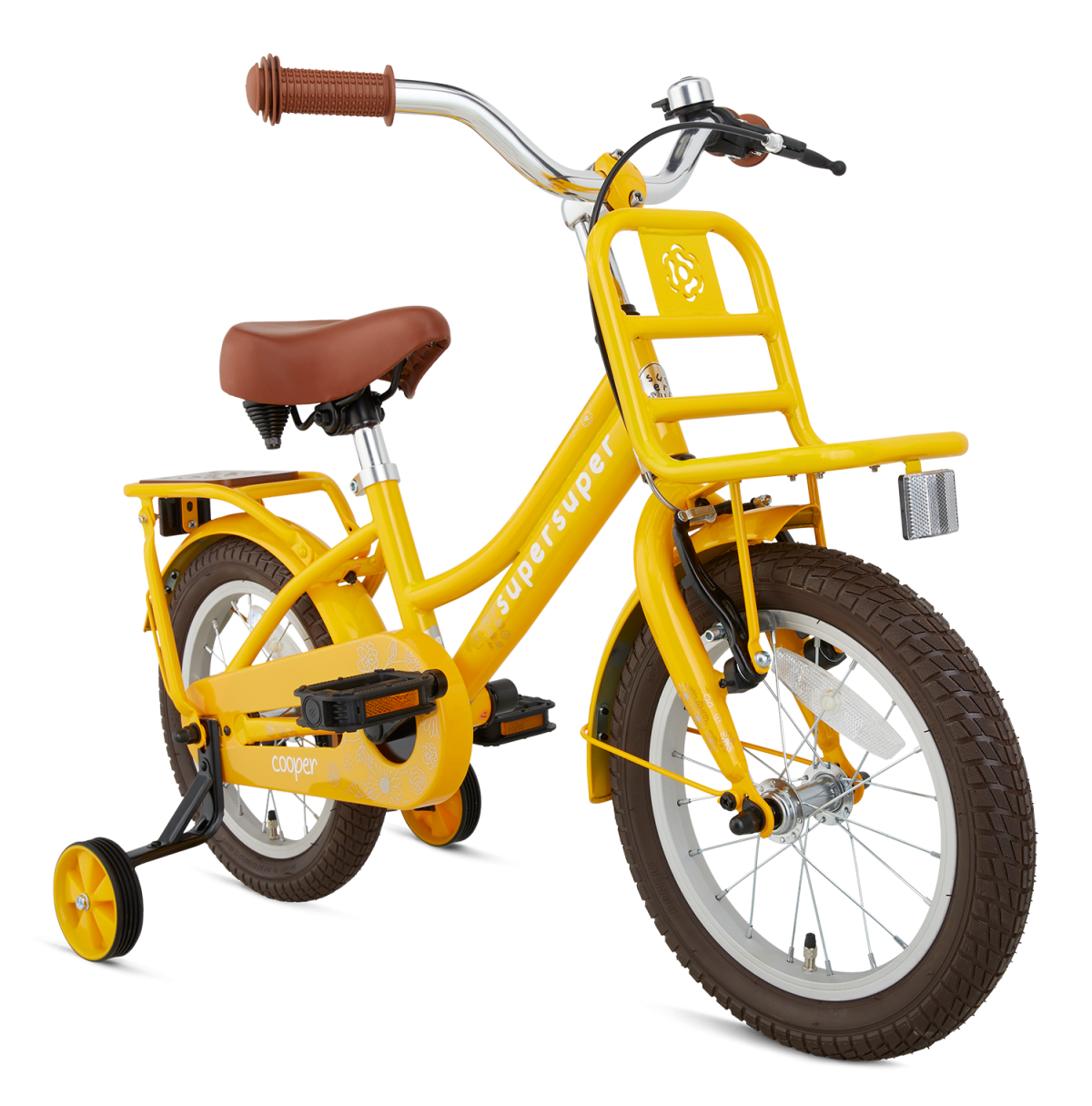 Cooper Bamboo er en utrolig flot pigecykel i klassisk retro stil med trendy touch – dyb gul farve med matchende mørkebrune cykeldæk og bambus plader på både bagagebæreren og frontladet – det er en cykel man lægger mærke til! Cyklen leveres med støttehjul, som på et tidspunkt kan tages af, når barnet i klar til at cykle uden.