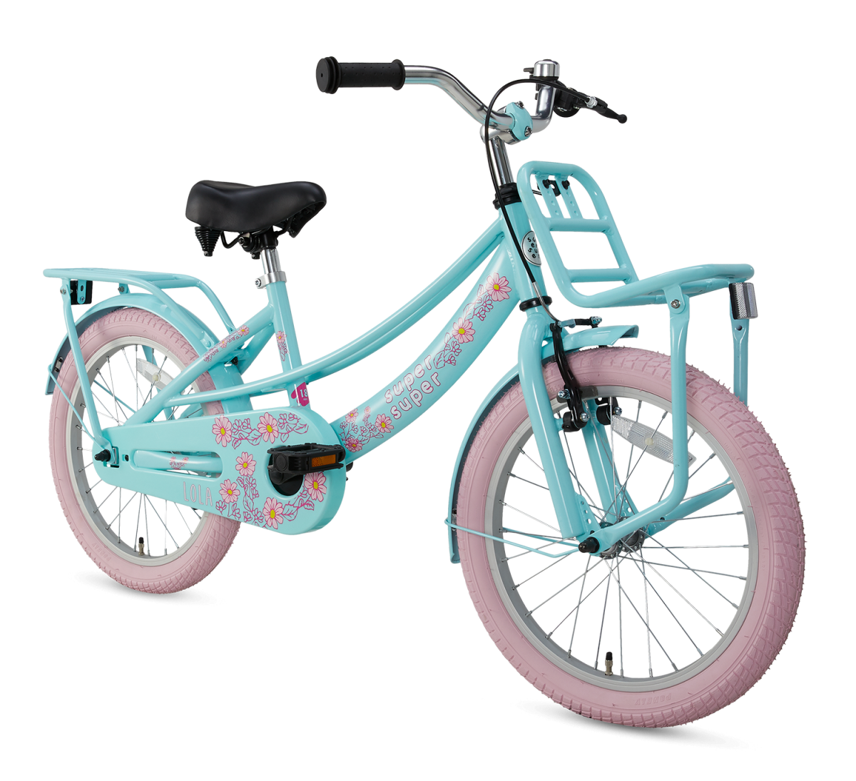 Lola Super Super 18 tommer i mint er en smart pigecykel i let og elegant design takket være cyklens konstruktion og nøje udvalgte farver – rammen i mint med cykeldæk i sart rosa farve. Cyklen er med både bagagebærer og frontlad, hvilket er en super praktisk løsning, specielt når man skal cykle med skoletaske og lign. At montere en cykelkurv er også en mulighed.