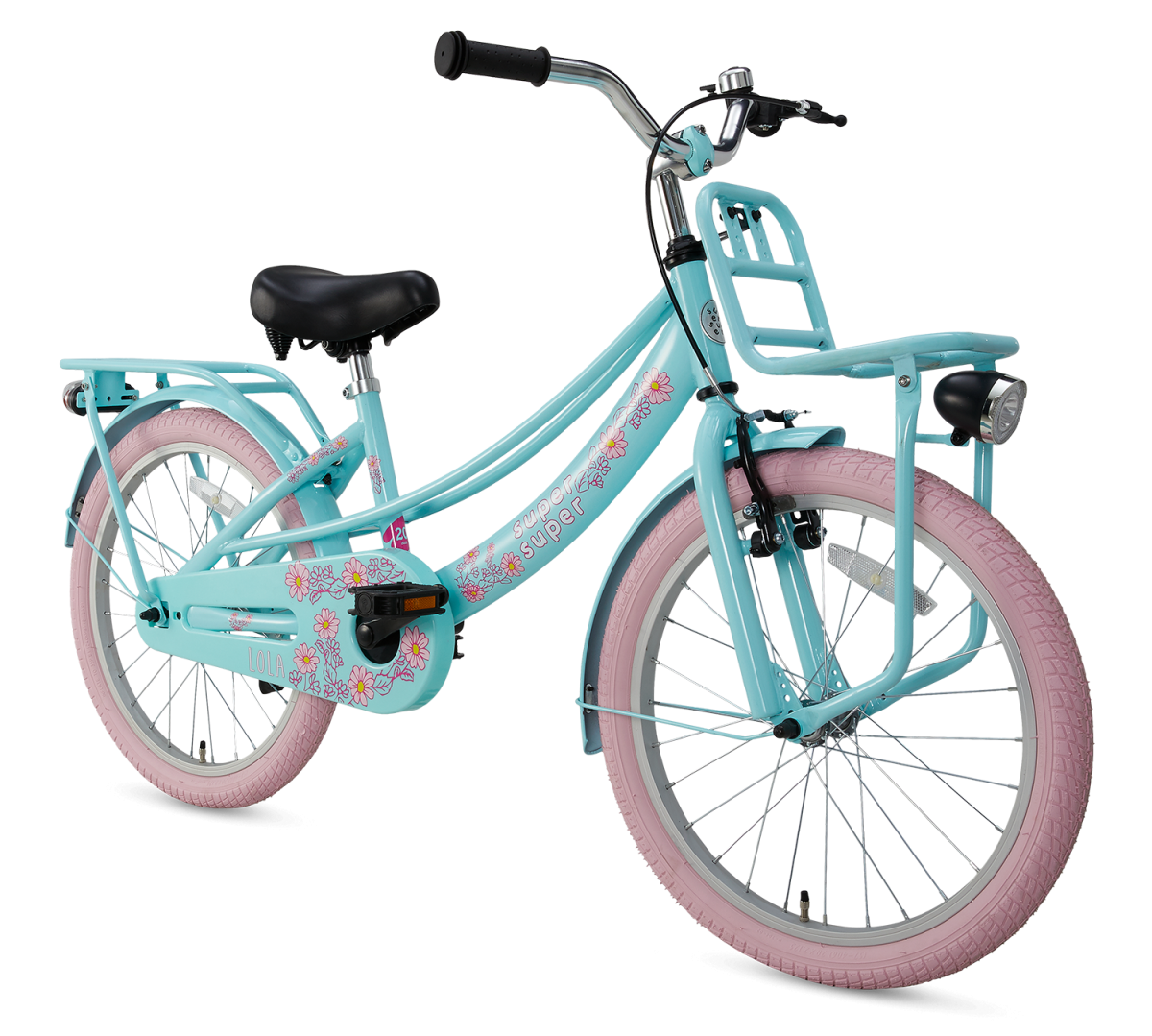 Super fin 20 tommer pigecykel Lola Super Super i skøn mint farve med cykeldæk i sart lyserød. Cyklen er med bagagebærer og frontlad, hvilke er ideelle til skoletaske mm. Cyklen leveres med LED lys, som sikrer at man kan cykle også i mørket – ideel for skolebørn, der selv cykler i skole. Cyklen er med bred og komfortabel saddel og praktiske håndtag.